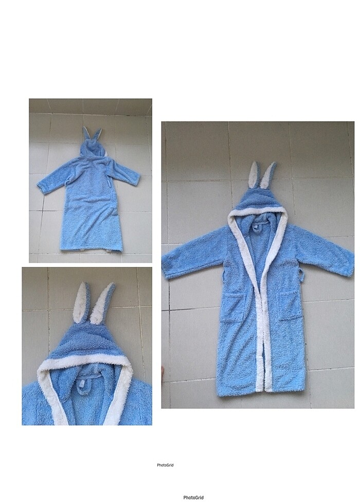 Tavşan kulaklı bornoz. Mavi beyaz. Soft havlu kumaş. Kuşağı yoktur! Cepli. Yan briti hafif sökülmüş. 9-10 yaş. Az kullanıldı. Uyguna #çocukbornoz #kulaklıbornoz