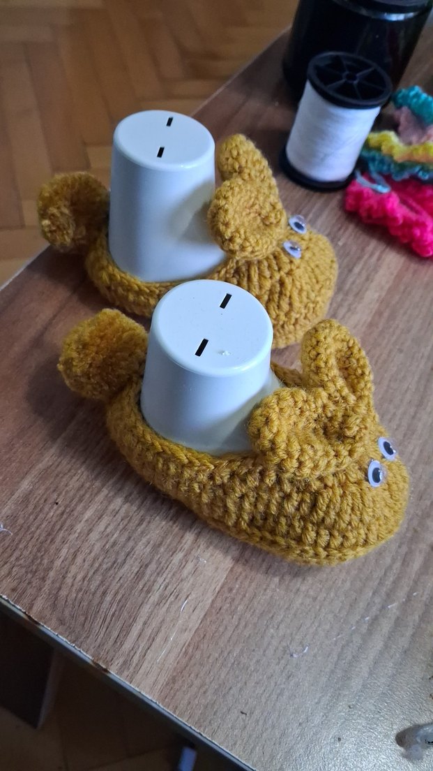 Yumuşak örgüden yapılmış, sarı renkli, sade ve bohem tarzda bebek patikleri.