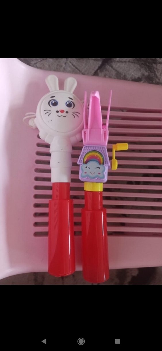 Renkli çocuk oyuncakları, tavşan yüzü ve gülümseyen gökkuşağı tasarımıyla, kırmızı saplı. Çocuklar için eğlenceli ve neşeli şekiller. Sallanan oyuncaklar