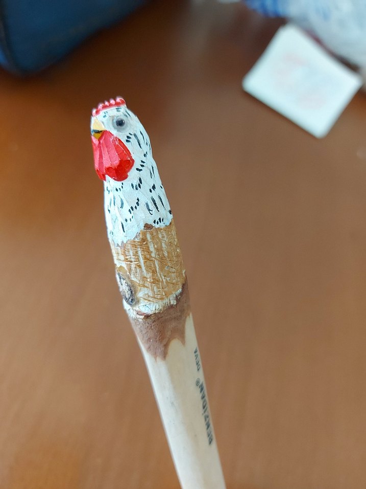 Renkli tavuk figürüyle süslenmiş beyaz kalem, yazmaya eğlenceli bir dokunuş katıyor. Ucu bitmiş tükenmez kalem