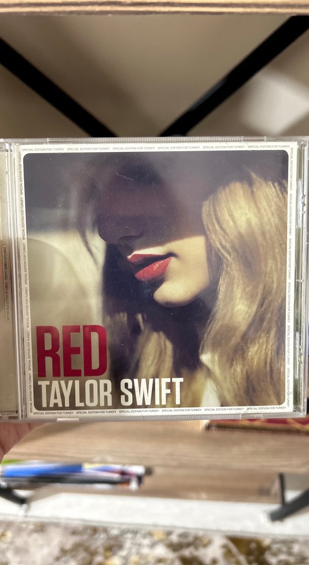 Taylor Swift'in "Red" albümünün CD'si, kapağında yüzünün yakından görüntüsü ve kırmızı rujuyla yer alıyor. Türkiye için özel baskıdır.