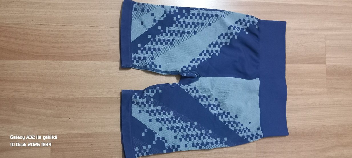 Parlak mavi sentetik kumaştan, elastik bel bantlı, normal midi boyda, hafif desenli, spor sokak tarzına uygun sort♀️