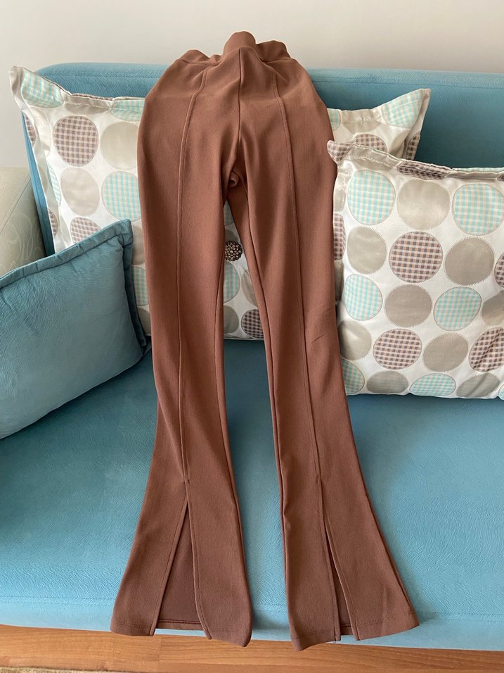 Kadın kahverengi tayt pantolon esnek bi yapıya sahiptir vücuda yapışır
