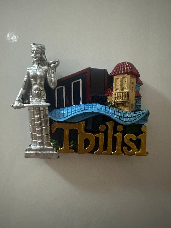 Parlak altın renkli "Tbilisi" yazısı, renkli mimari detaylar ve gümüş bir heykel içeren magnet tiflisten alındı.