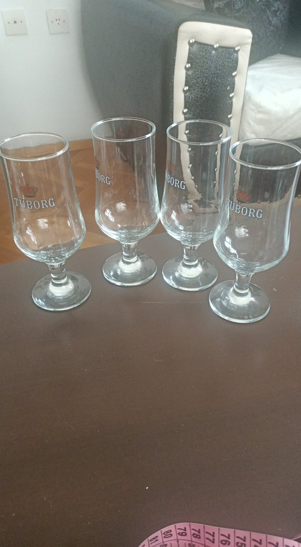 Her biri üzerinde "tuBORG" yazılı, dört adet ayaklı şeffaf bardak seti. Tuborg