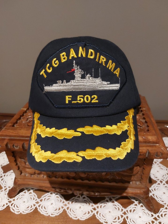 Koyu renk lacivert erkek şapka, gemi ve "TCG BANDIRMA F-502" yazılı altın işlemeli. Ön kısmında altın defne yaprak işleme desenleri bulunmaktadır ⚓