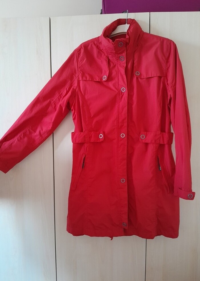 Bir kez kullanılmıştır.42 beden, bayrak kırmızısı, belden ve koldan ayarlamalı, file astarlı, arkadan yırtmaçlı, önden çıtçıtlı düğmeli ve gizli kapşonludur. Cepleri fermuarlıdır. Ölçüler: Boy omuzdan etek ucuna 87cm, En iki kol arası 54cm, Kol boyu 65 cmdir.