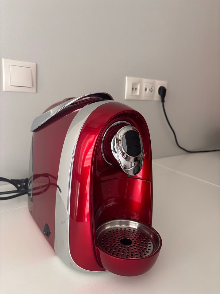Canlı kırmızı renkte, şık tasarımlı ve krom kaplamalı musluğu olan kompakt kahve makinesi. Kullanılmadığı için satıyorum herhangi bir sorunu bulunmuyor çalışıyor
