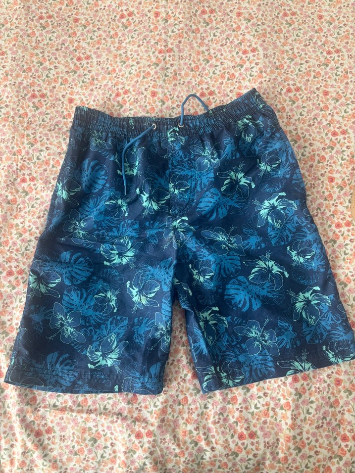 Mavi renkli, çiçek desenli erkek mayo, elastik bel ve bağcıklı rahat tasarım sunar. Ön kısmında resimdeki gibi hafif bir renk atması var kullanıma engel bir durumu yoktur. 12-13 yaş etiketlidir