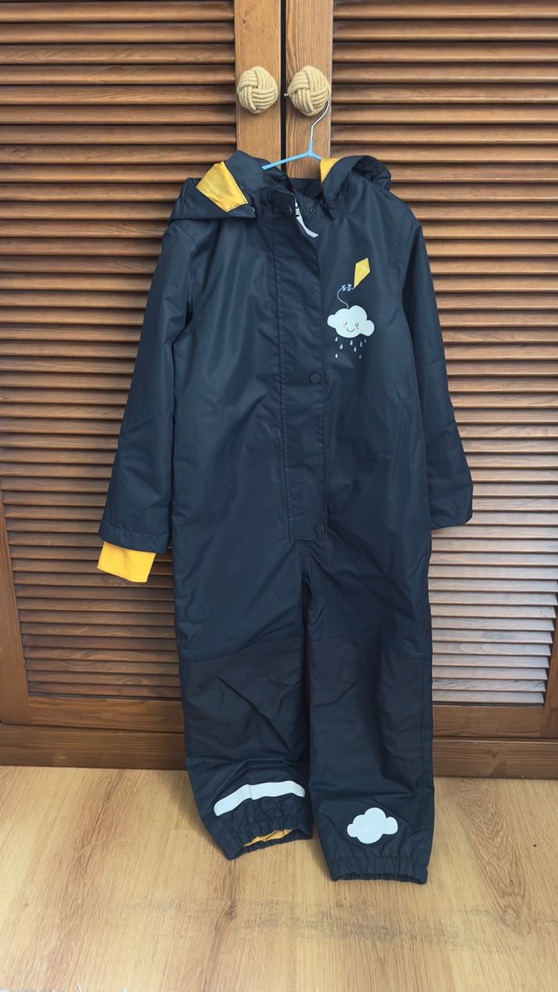 kapüşonlu ve yumuşak fleece astarlı koyu mavi erkek bebek yagmur tulumu. Bulut ve uçurtma baskılı,