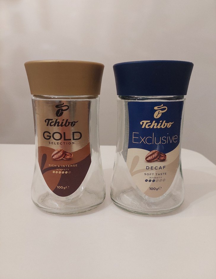 İki adet Tchibo kahve kavanozu, biri parlak altın kapaklı Gold, diğeri koyu mavi kapaklı Exclusive Decaf, her biri 100g kahve alır☕ Fiyat görseldeki 2 adet kavanozun toplam fiyatıdır.