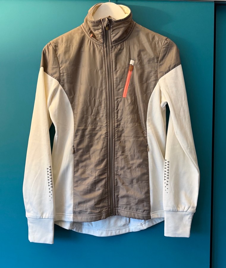 Fermuarlı ön ve göğüs cebi bulunan, uzun kollu ve yüksek yakalı, bej ve gri tonlarda sentetik kumaştan yapılmış kadın spor ceketi.