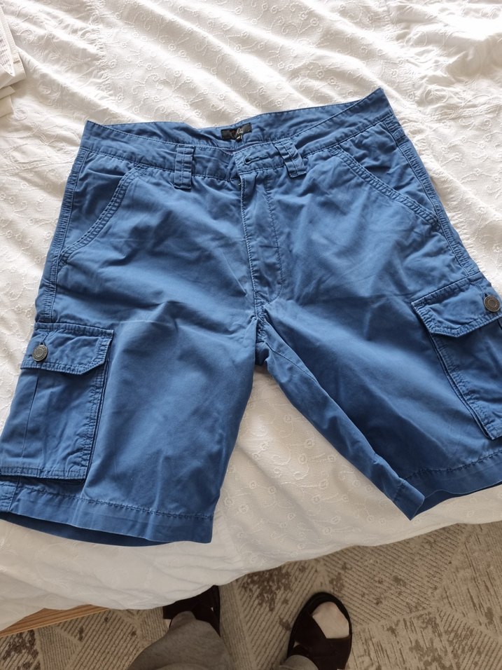 ürün az kullanmıştır, hiç bir kusuru-defosu-sorunu yoktur, denizci mavisi tarzı çok güzel bir rengi vardır, çok ceplidir, aynısından 2 tane olduğu için satıştadır, yumuşacık bir kumaşı vardır, ölçüleri beli 42 cm boyu 49 cm, paçasının eni 26 cm. Yanlarda cep detaylarıyla günlük kullanım için uygundur. Large beden ayarındadır