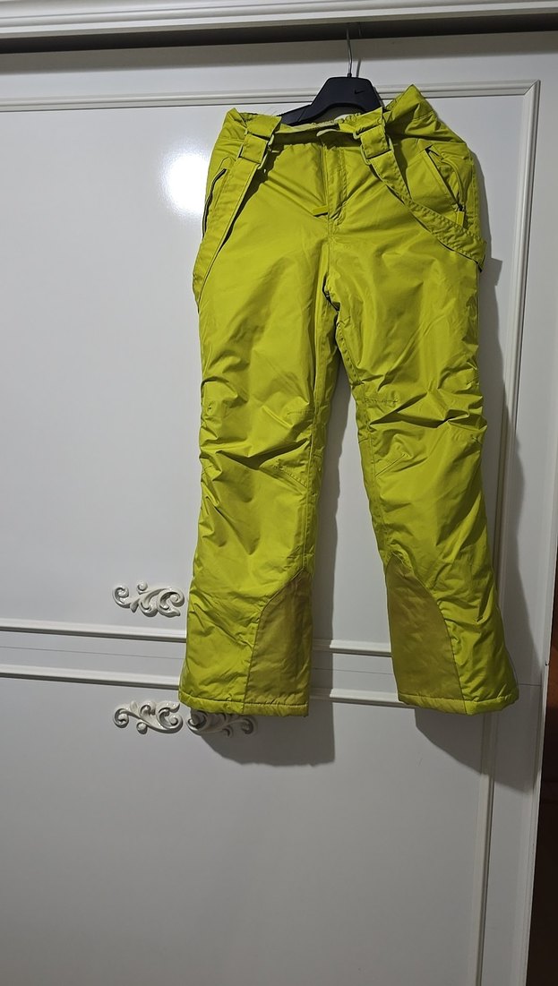 Parlak yeşil renkte, kemerli ve dar kesim erkek kayak pantolonu. Sentetik kumaştan, normal midi boyda, outdoor kullanıma uygun. Cok iyi durumda 11.12 yas
