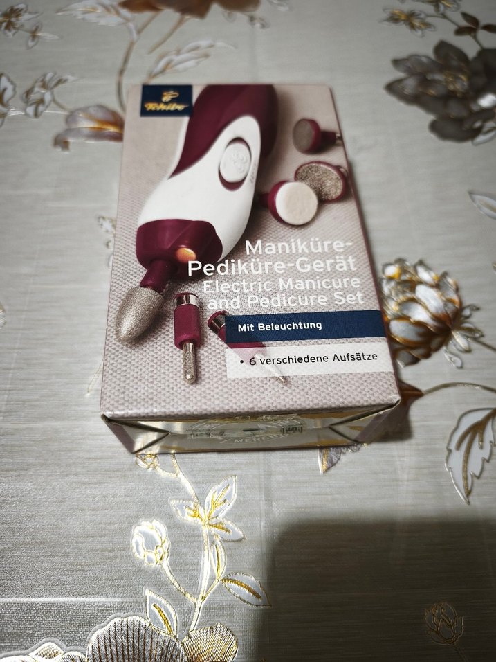 Tchibo marka manikür ve pedikür Aleti, 6 farklı başlık ve hassas bakım için ışık özelliği içerir. sağa,sola dönüş,hızlı,yavaş ayarları vardır.2 adet kalem pil ile çalışır.Kutu içeğinde piller yoktur.Ürün yenidir.