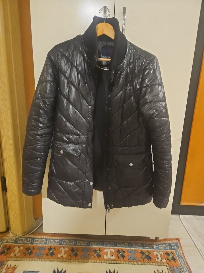 TCHİBO siyah fermuarlı ön kısmı ve uzun kollu rahat yumuşak elyaflı çıkarılabilir kapşonlu yaka ve kapitone deseniyle sokak stiline uygundur. kol ağızlarında hafif incelme var