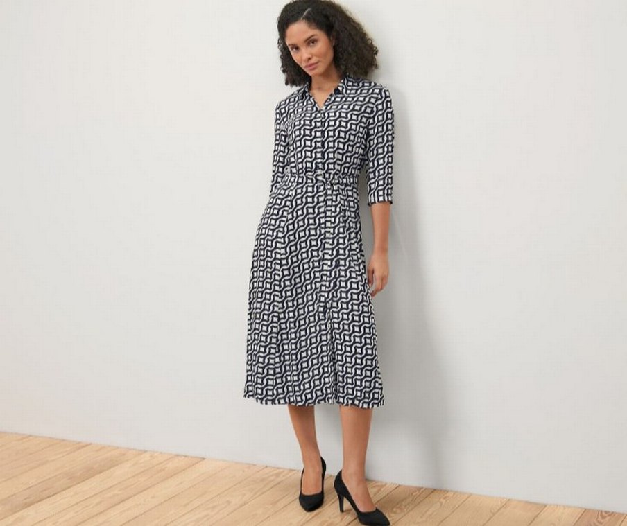 Gri ve beyaz desenli, v yakalı ve üç çeyrek kollu uzun elbise. Yumuşak sentetik kumaştan, günlük kullanıma uygun.