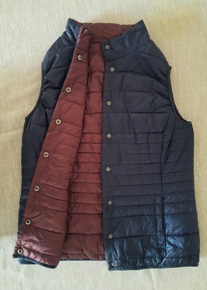 Çift taraflı kullanılabilir. Bir tarafı lacivert, diğer tarafı bordo, Tchibo puf yelek. İki tarafında da yan cepler var. Önden çıt çıtla kapamalı. Hiç giyilmedi. 40 beden. Dar kesim.