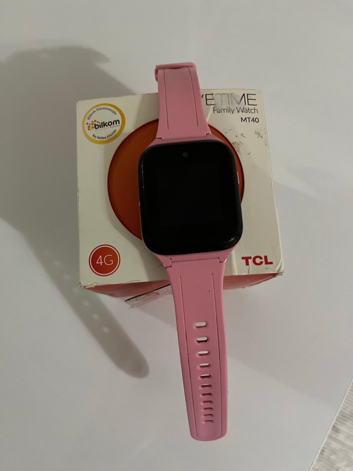 TCL MT40 Family Watch, pastel pembe renkte, 4G bağlantı ve rahat silikon kayışa sahiptir. Temel akıllı saat fonksiyonları sunar. Kızıma telefon aldığımızdan satıyoru çalışır hiçbir sorunu yoktur.