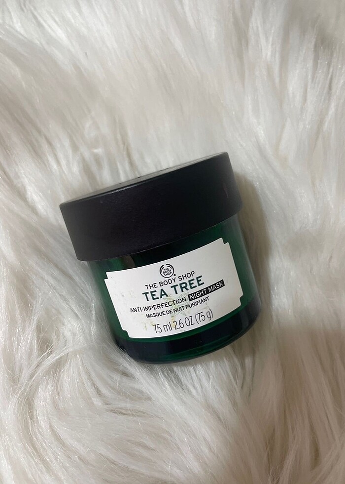 The body shop tea tree çay ağacı özlü gece maskesi. Lekelerin görünümünü gözle görülür şekilde azaltır. Lekeli ve hassas ciltler için uygundur. Bir kez kullandım. 75ml büyük boy cam şişe kutu.