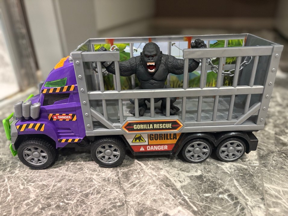 Kafesli gri oyuncak kamyon, içinde detaylı goril figürü taşıyor. "GORILLA RESCUE" ve "DANGER" etiketleriyle kurtarma teması vurgulanıyor. Üç tane düğmesi var biri müzik biri tırı yürütüyor öbürü de goril bağırarak zincirlerinden hareket ederek kurtulmaya çalışıyor. Pil takılacak ürün sorunsuz çalışıyor.