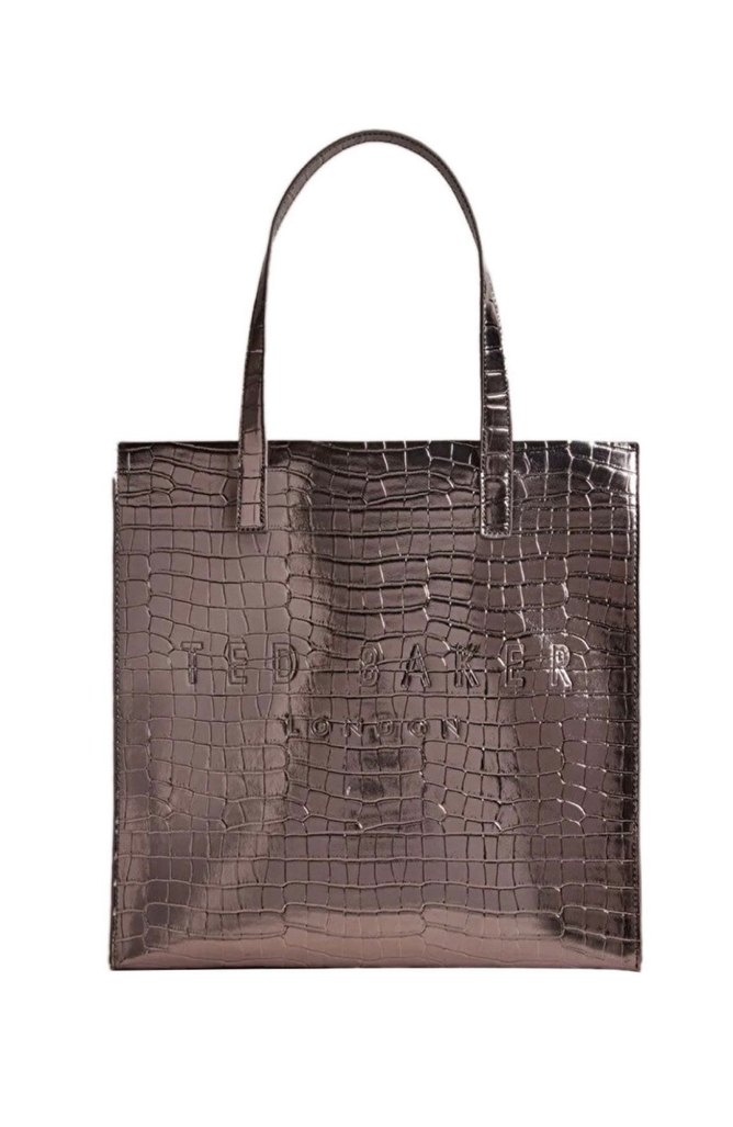 Ted Baker gri deri kadın çanta, yılan derisi desenli. Son görsel dışında hiçbir sorunu yoktur. Çok temiz ve özenli kullandım. Büyük boy ve çok şık.