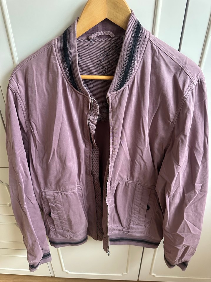Mor renkte, düğmeli, bol kesim, uzun kollu erkek bomber ceket. Yumuşak keten kumaştan, günlük rahat sokak stili için uygundur. Notlu yaka ve normal boyda.