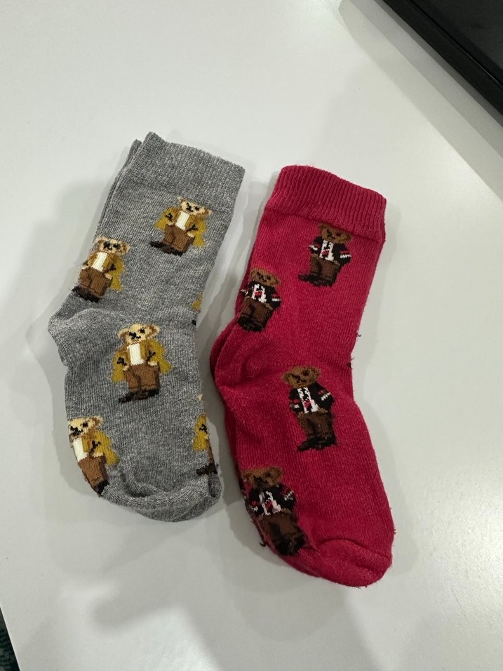Nakışlı ayı desenli, yumuşak ve sıcak kumaştan yapılmış çok renkli çorap 1 yaş için uygundur 1 kez kullanıldı .