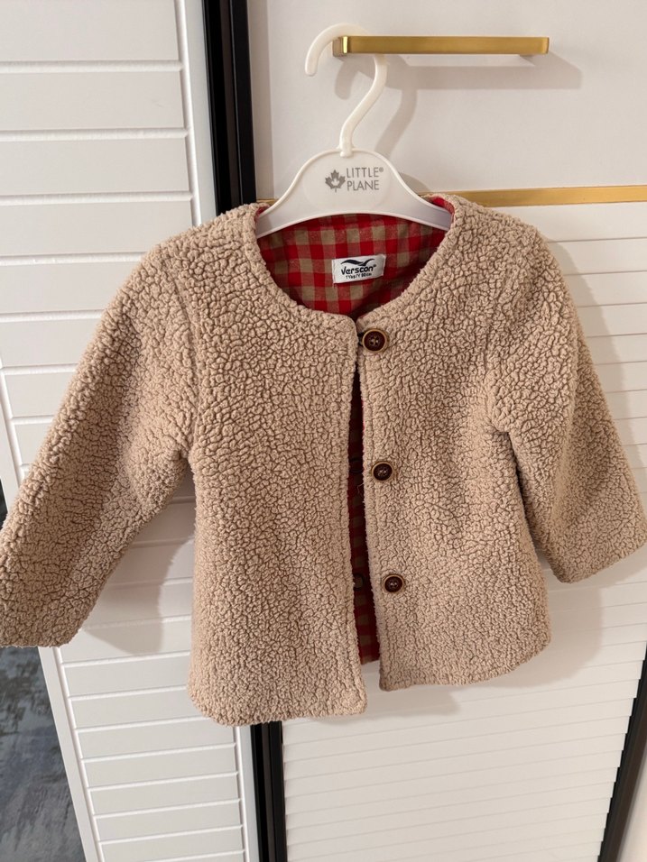 Kız çocukları için düğmeli, açık kahverengi, bol kesim uzun kollu hırka. İç kısmı kırmızı kareli astarlıdır ve yumuşak, sıcak bir dokuya sahiptir.