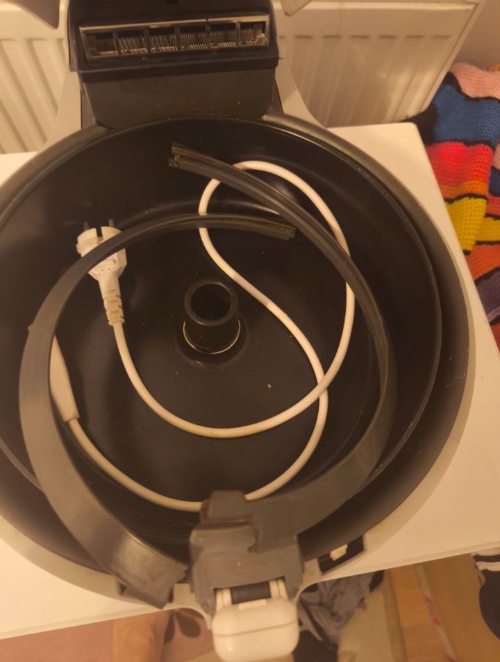 Bej ve gri renkte, çıkarılabilir sepet ve kabloya sahip elektrikli fritöz. Kızartma ve ızgara için uygundur.