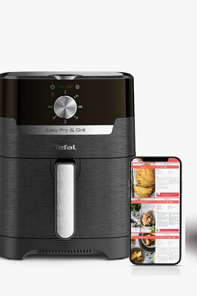 Tefal Easy Fry&Gril gri renkli, kızartma ve ızgara fonksiyonlarıyla çok yönlü pişirme sağlar. Basit kontrol düğmesi ve tarif uygulaması bulunur.