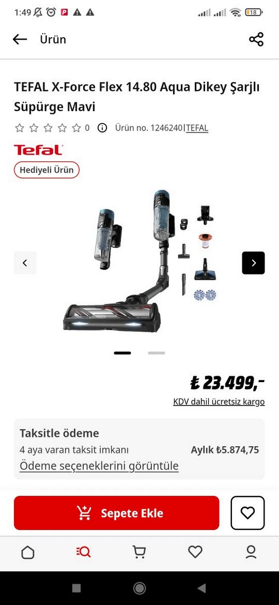 Tefal kablosuz siyah elektrikli süpürge, çeşitli aparatlarla birlikte gelir ve 4 aya varan taksit imkanı sunar. Kargo ücretsizdir.