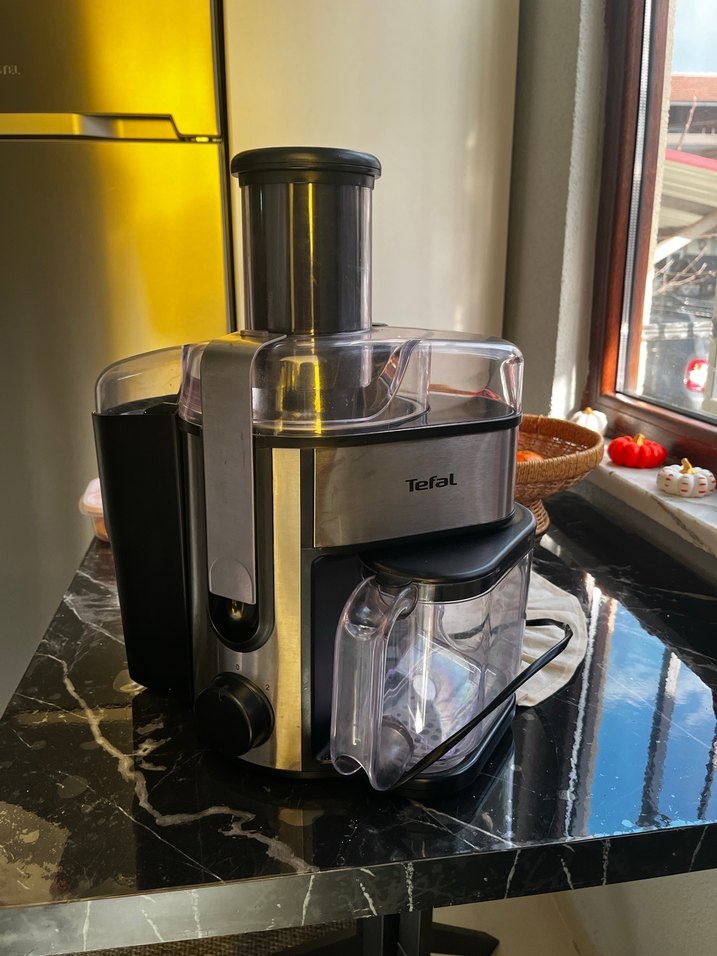 Tefal markalı siyah ve gri renkli, şeffaf meyve suyu haznesine sahip katı meyve sıkacağıdır.