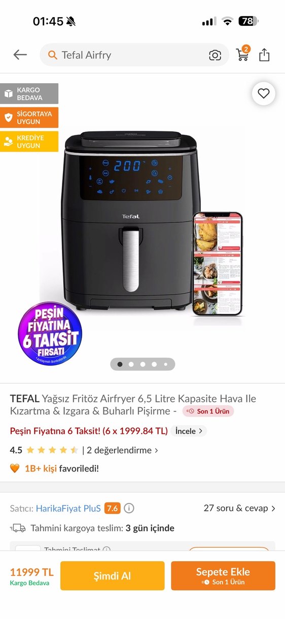 TEFAL Airfryer, 6,5 litre kapasitesiyle yağsız kızartma, ızgara ve buharlı pişirme yapar. Dijital kontrol paneliyle kolay kullanım sağlar. 3 yıl kullanıldı sadece çeyizime almiştim ama cok kullanmadıgımı fark edince ve mutfaktada yer olmayınca satısa koydum