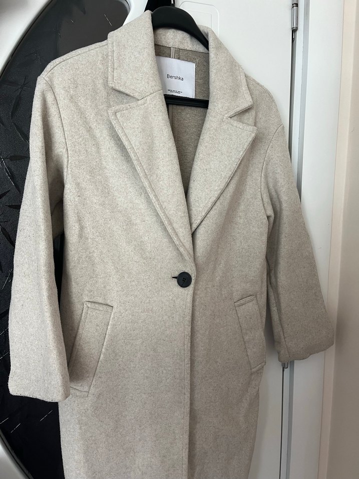 Tek düğmeli, iki cepli bej uzun kaban bershka