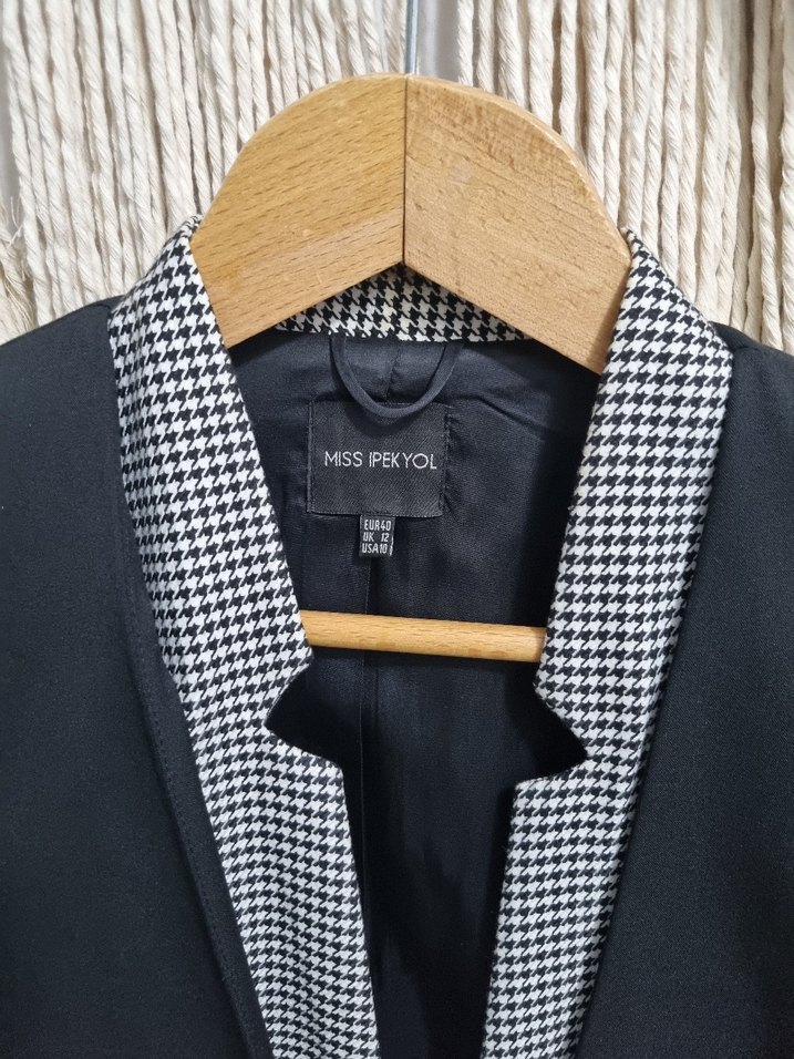 Gri renkli, düğmeli, ekose desene yakalı siyah blazer. Uzun kollu ve ofis kullanımı için uygundur. 40 beden ancak daha dar kesim diyebiliriz. Bir kez giyildi. Marka: Miss Ipekyol.