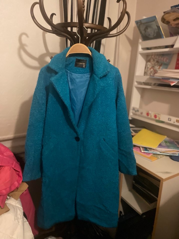 Tek düğmeli kapama, yumuşak dokulu kumaş ve canlandırıcı mavi renkte kadın kabanı. Klasik yaka ve yan cepler bulunur.