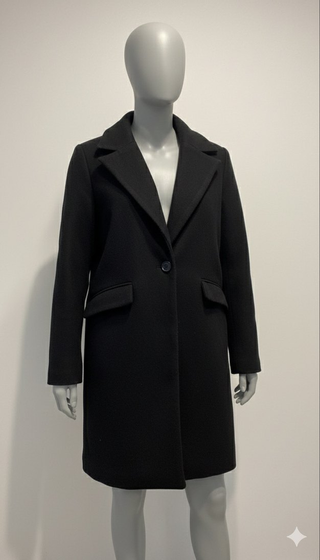 Tek düğmeli ve iki cep kapaklı siyah kaban, klasik ve şık bir görünüm sunar. Serin havalar için uygundur.