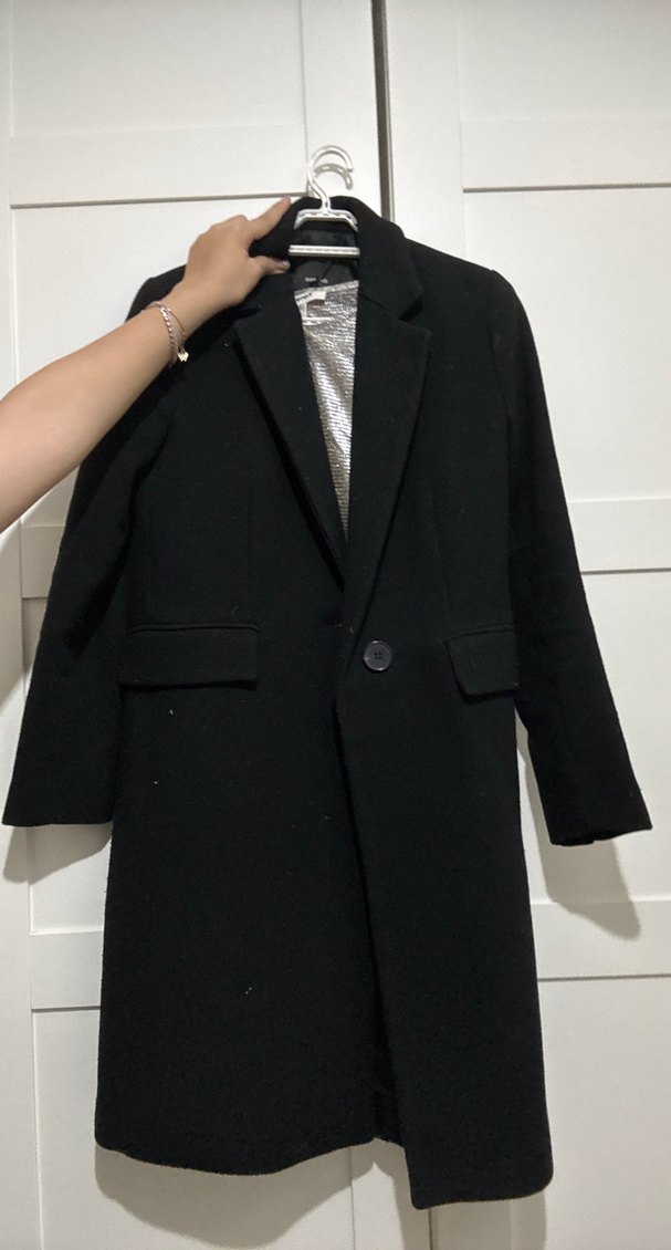Tek düğmeli, uzun kollu siyah kaban, klasik yaka ve kapaklı ceplerle, rahat iç astara sahip.