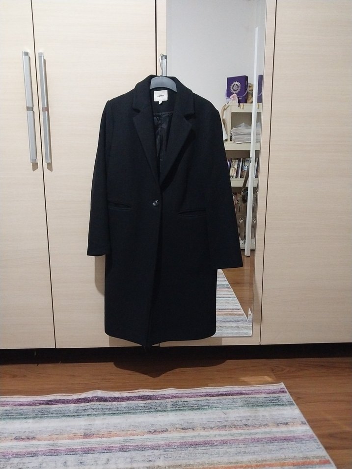 Tek düğmeli, klasik yakalı siyah kaban, iç kısmı rahatlatan yumuşak astar ile tamamlanmıştır. Az kullanıldı.Kusuru yoktur.Boyu 102 cm.1.65 te dizde duruyor