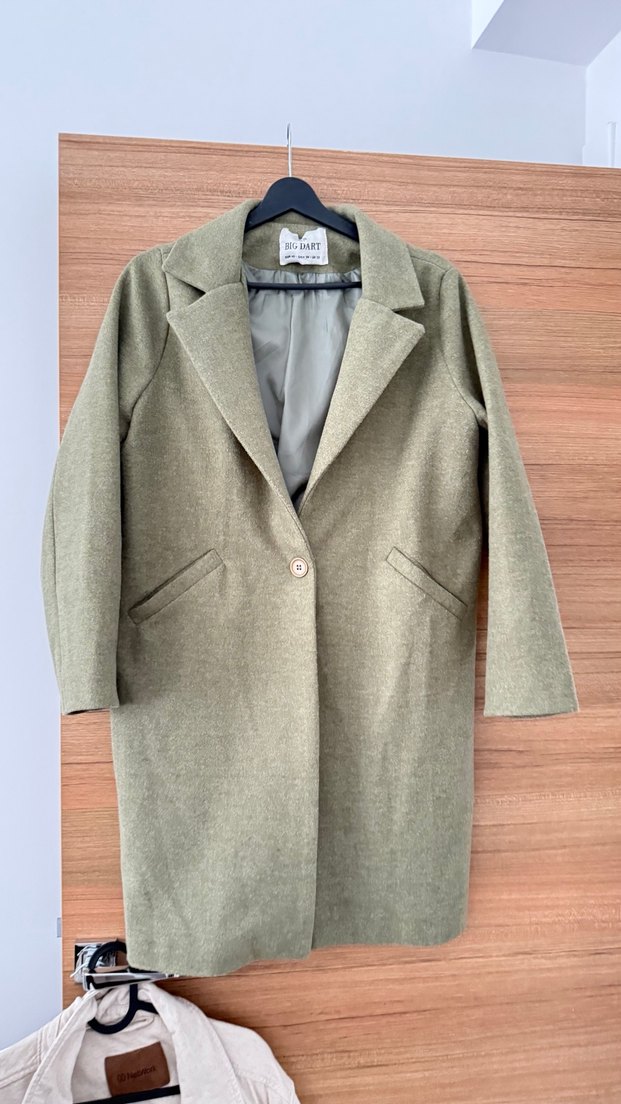 Tek düğmeli kapamalı, yumuşak astarlı uzun haki kaban. Klasik yakalı ve iki cep detayına sahip, soğuk havalar için ideal.