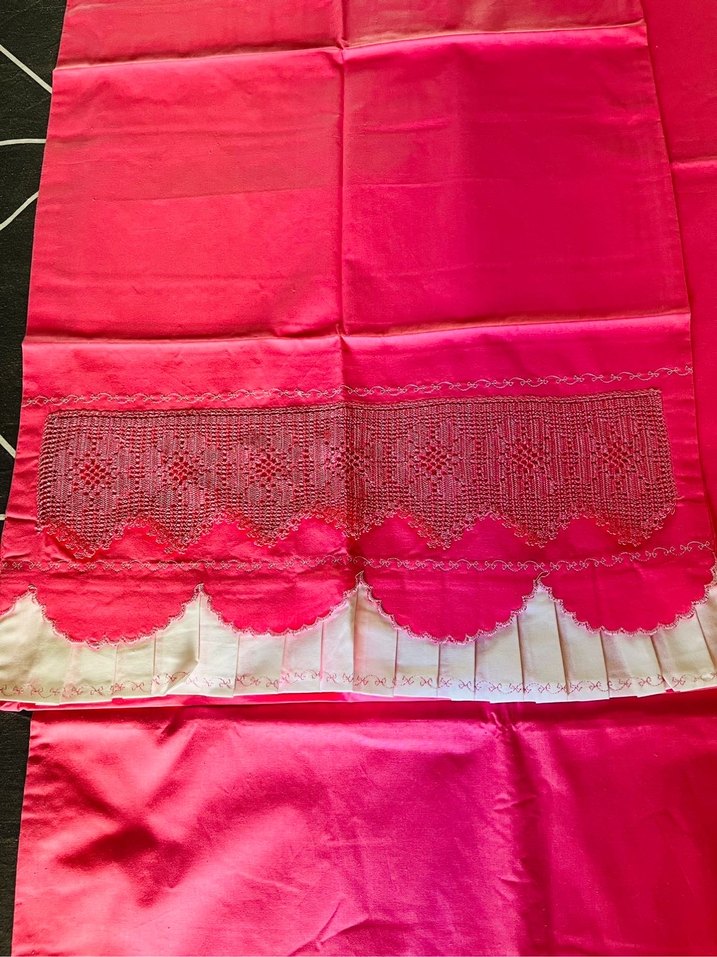 Parlak pembe renkte, işlemeli desenlere sahip. Dalgalı kenarlar ve ince dantel detayları bulunur. Kullanılmamış ve yıkanmamıştır. Aynısından iki adet olduğu için birini satıyorum. Bir adet çarşaf bir adet yastık kılıfı