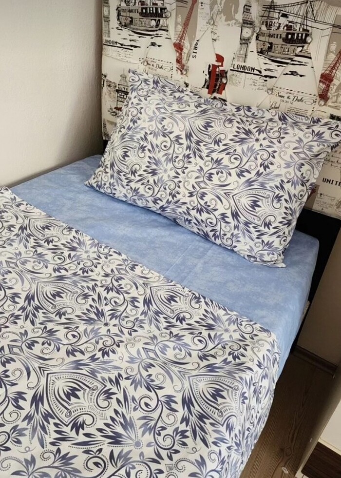 Kendi imalatimizda dikilir kumaşı 100 /100 pamuk rengi mavi desenli alt carsafi sade mavi rengi akmas kirismaz 30 derecede ikanir carsafi lastiklidir 2 adet yastık kılıfı ve yorganı var