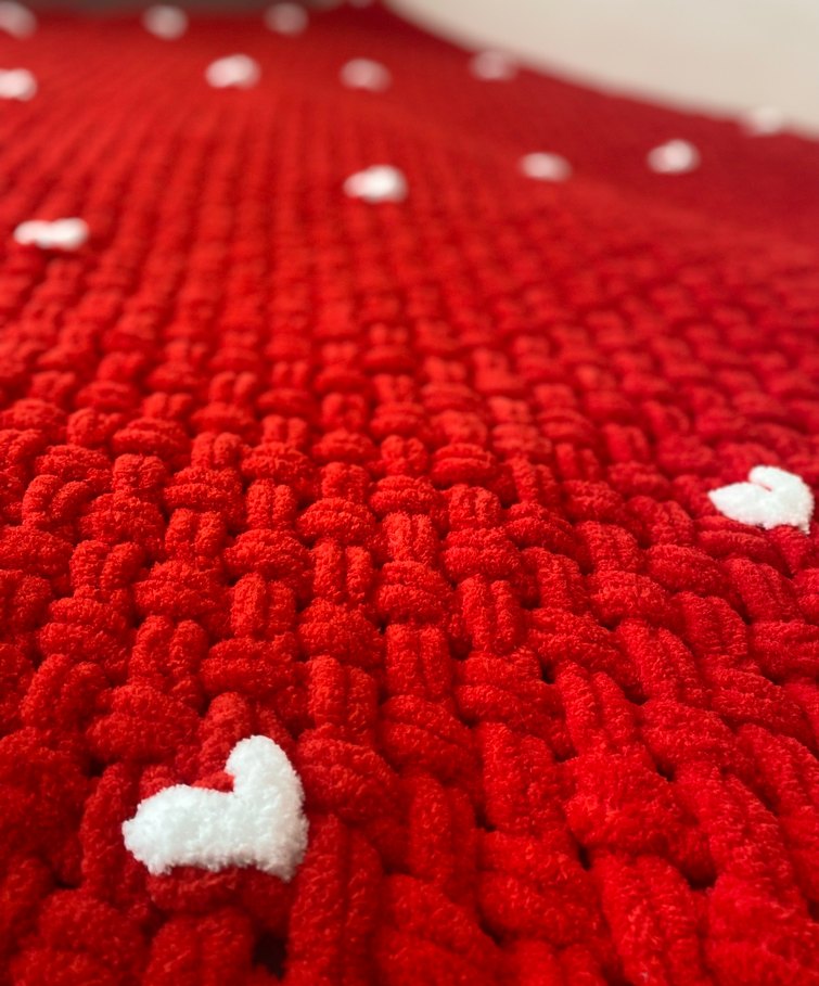 Tek kişilik üzerinde beyaz kalp detaylı ,kırmızı renkte battaniye/ orta boy yastık takımı.