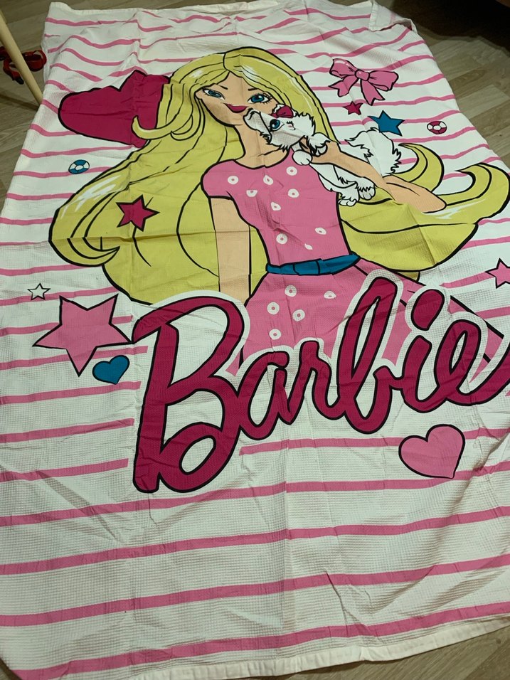 Yumuşak sentetik kumaştan yapılmış, renkli baskılı pembe çocuk pikesi. Üzerinde kız ve evcil hayvan figürü ile 'Barbie' yazısı bulunur.1-2 kez kullanıldı