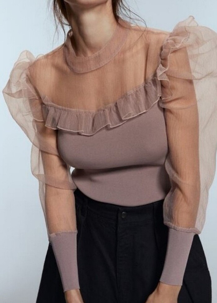 Üst kısmı ve kolları tül triko kazak. İki kol altı 57, boyu 55 cm. Marka temsili