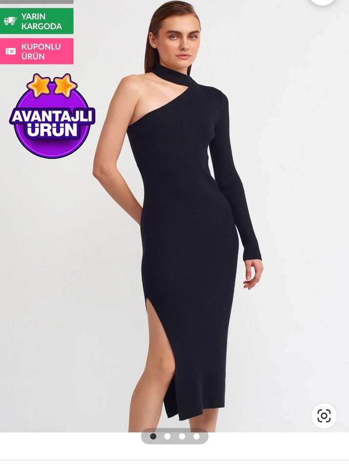Tek kollu boyun detaylı triko siyah elbise tek tarafında yandan yırtmacı mevcut orjinal dilvin kalitesi tok yumşak bir kumaşa sahip standart beden s-m-l bedene uyumlu olacaktır
