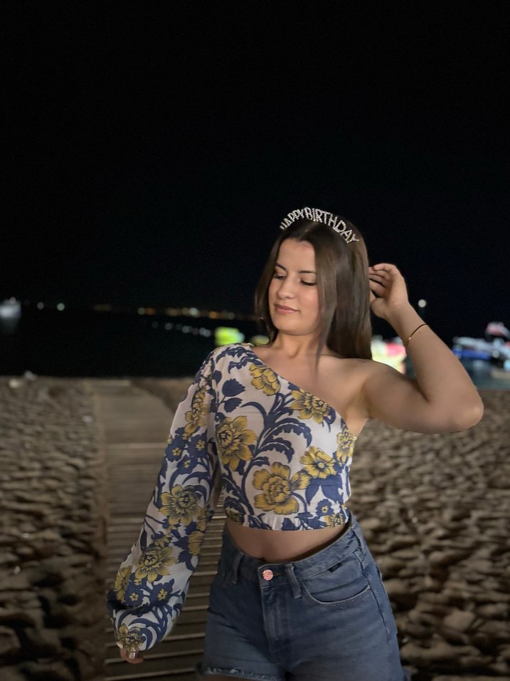 Tek omuzlu, uzun kollu ve bol kesim kadın crop top, denim kumaştan yapılmış, açık mavi tonlarında çiçekli ve drapeli detaylara sahip, parti için uygun.
