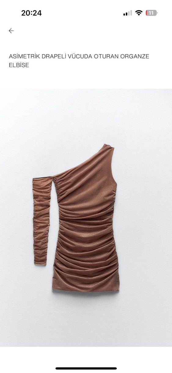 Bej renkli, tek kollu ve drapeli detaylara sahip, parlak sentetik kumaştan mini elbise. Günlük kullanıma uygun çağdaş ve minimalist tarzda.