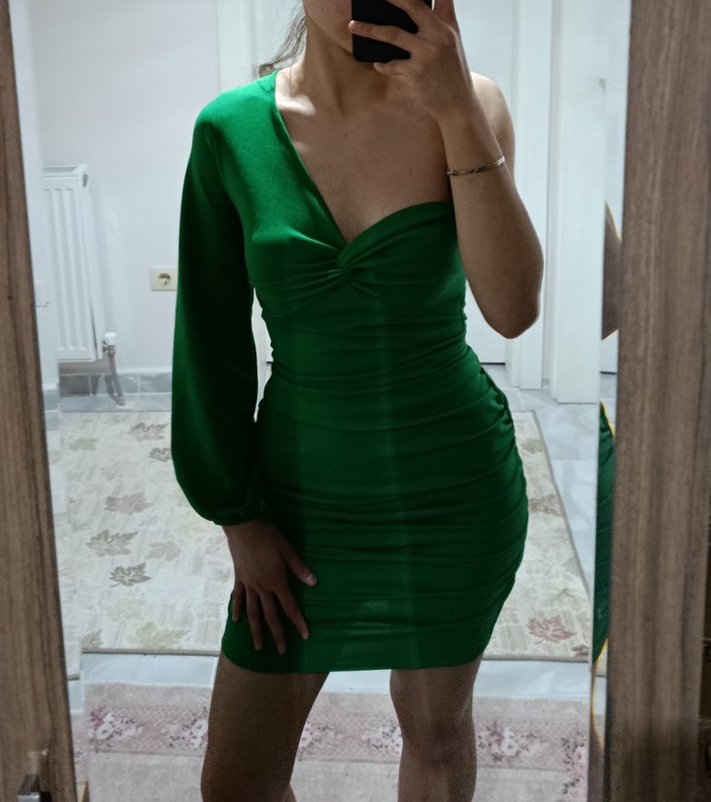 Parlak yeşil, tek kollu ve drapeli tasarıma sahip, vücuda oturan mini elbise. Pürüzsüz sentetik kumaştan, modern tarzda. 1 kez kullanıldı ✨
